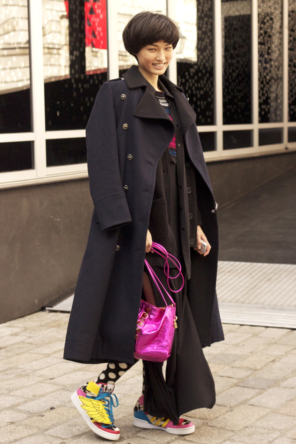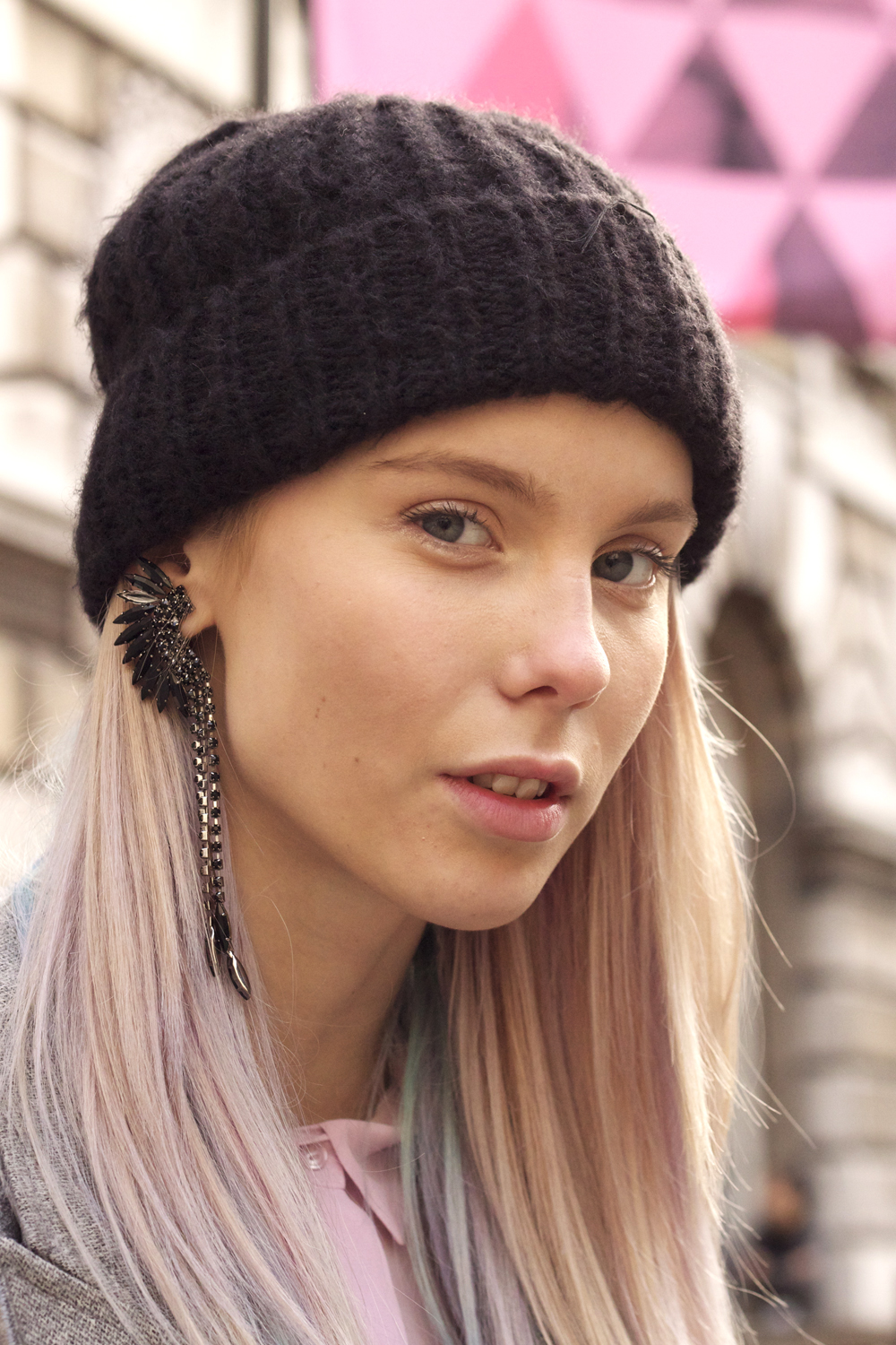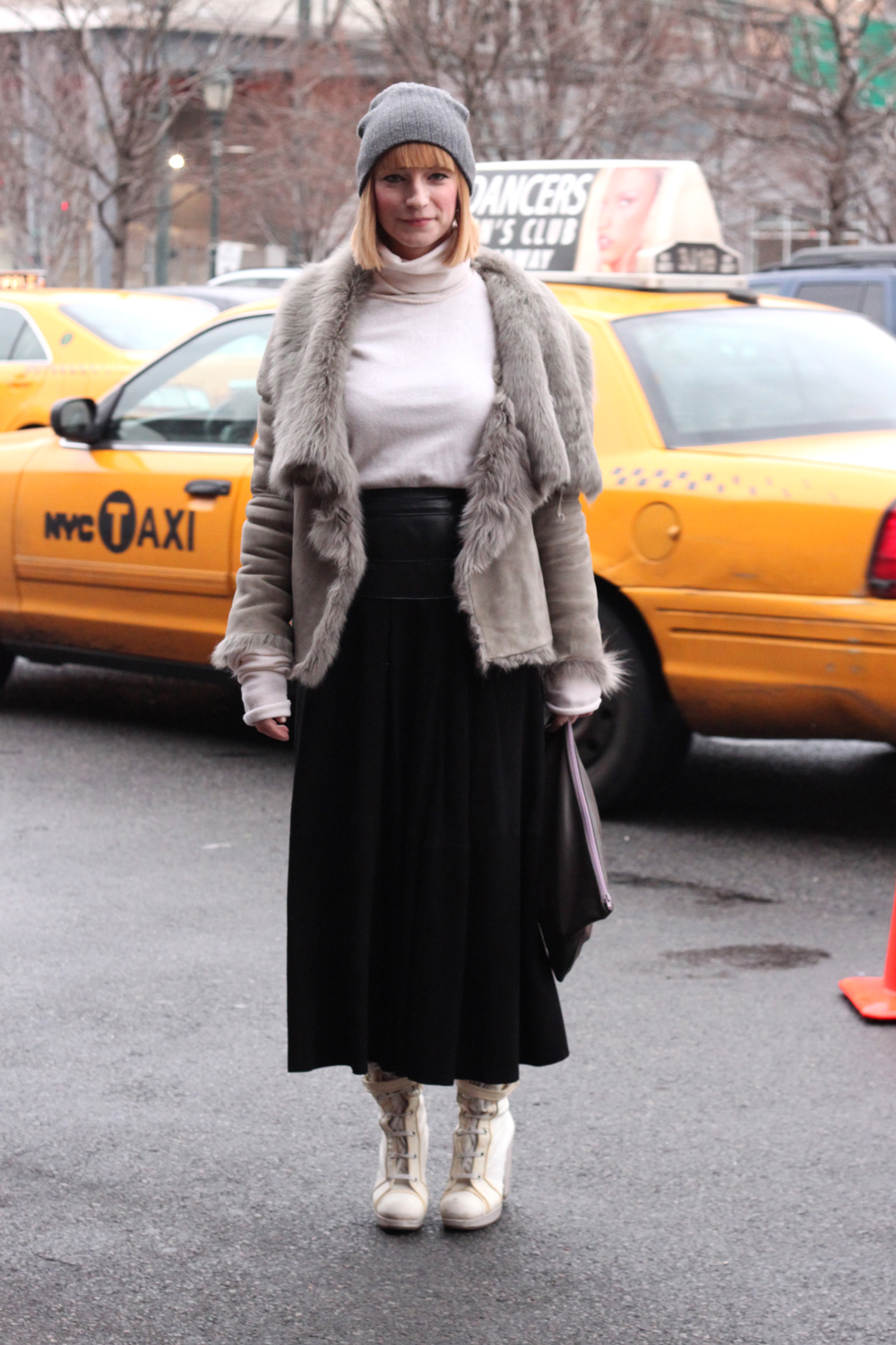 I met the charming Christiane outside the Giorgio Armani show, then bumped into her again, post costume change outside Roberto Cavalli. Here she wears a coat and skirt by Escada, top by Acne, boots by Clautre Chose, hat by Lala Berlin and sunnies by Ralph Lauren.