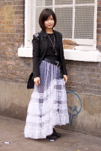Nicole wears jacket from Unconditional, skirt made from a wedding dress, Belt by Vivienne Westwood, necklace from Brick Lane and vintage men’s shoes
