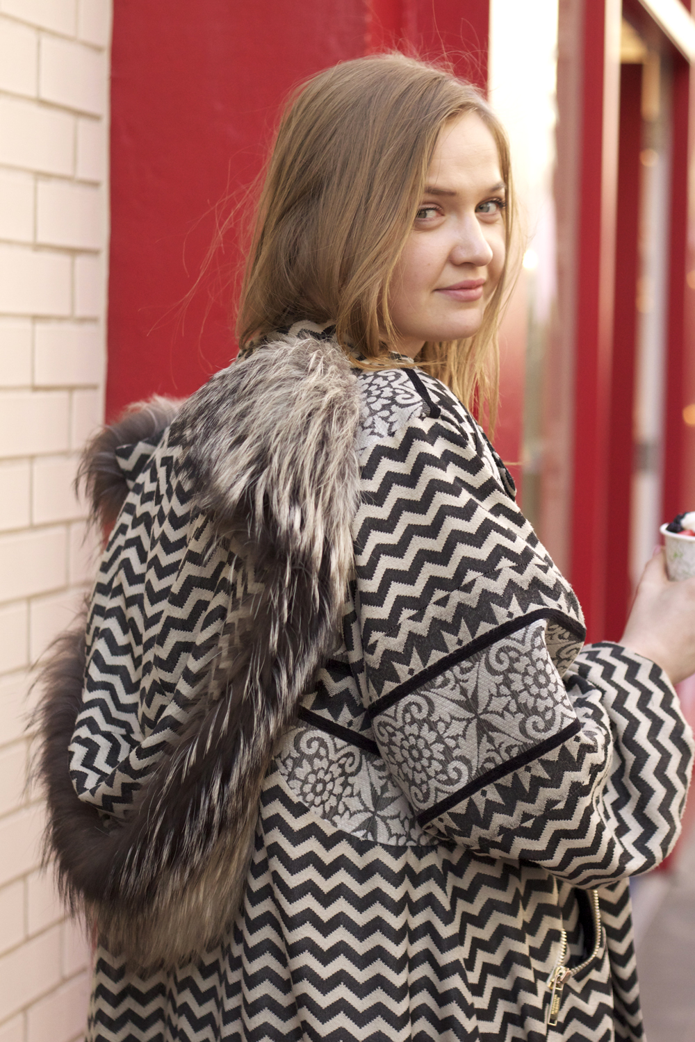 I spotted Veronica walking down Carnaby Street in her amazing outfit as she ate her yummy looking frozen yoghurt. She wears a dress by Michael Van Der Ham, coat by Matthew Williamson and metallic shoes by Alexander McQueen. The colours and collage effect of this dress are beautiful and she has perfectly matched the hues of the dress with the rest of her outfit. You can get a similar style dress by Michael Van Der Ham on Net-A-Porter here. I love how the huge furry hood of her coat creates an angel-wing like effect, while the geometric shapes and embroidery add a great twist of detail to a parka.