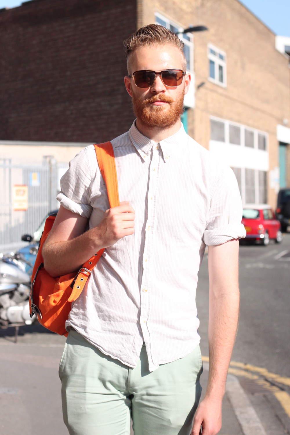 Brian has a wonderful moustache. I do enjoy a moustache and his one gets a big thumbs up from me. He wears trousers by Dr Denim, Oxford shirt by J Crew, Vans classics and Ray Ban sunglasses.