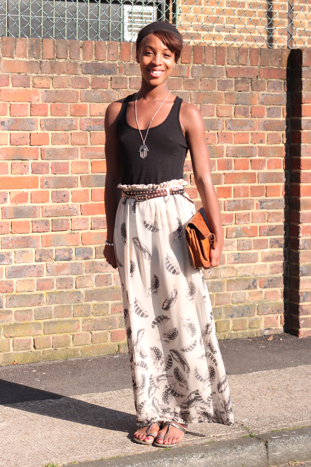 Tiffany masters daytime chic in this floaty, feather print maxi. She wears skirt from River Island, vest from H&M, sandals from Primark, clutch from Italy and necklace from Marrakech