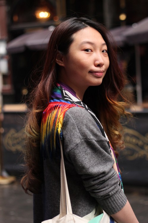 April’s rainbow of accessories brightens up the dullest of days. I absolutely love her techni-coloured fringed scarf. It’s an amazing piece to jazz up a neutral garment such as her grey cardigan.