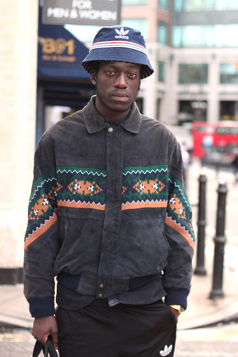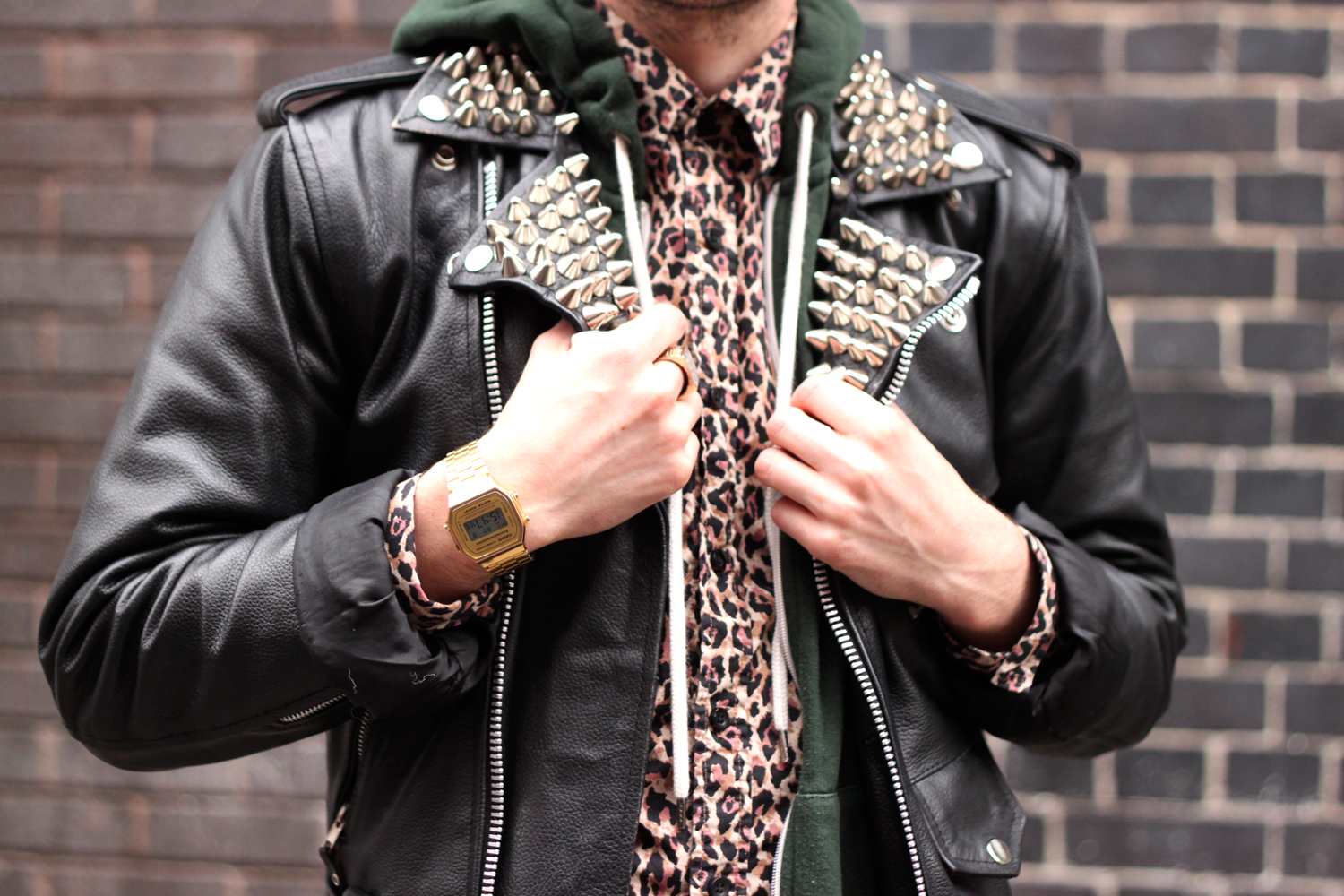 Nick wears vintage leather jacket from Paris, Levis denim jacket from Berlin, Tom’s shoes, jumper from a charity shop, jeans by Primark and scarf made by his girlfriend.