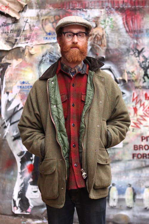 Michael wears a vintage jacket from Portobello Road, Loreak Mendien shirt from Australia, vintage shirt (worn over other shirt), vintage glasses, Grenson shoes, and the hat was a gift.