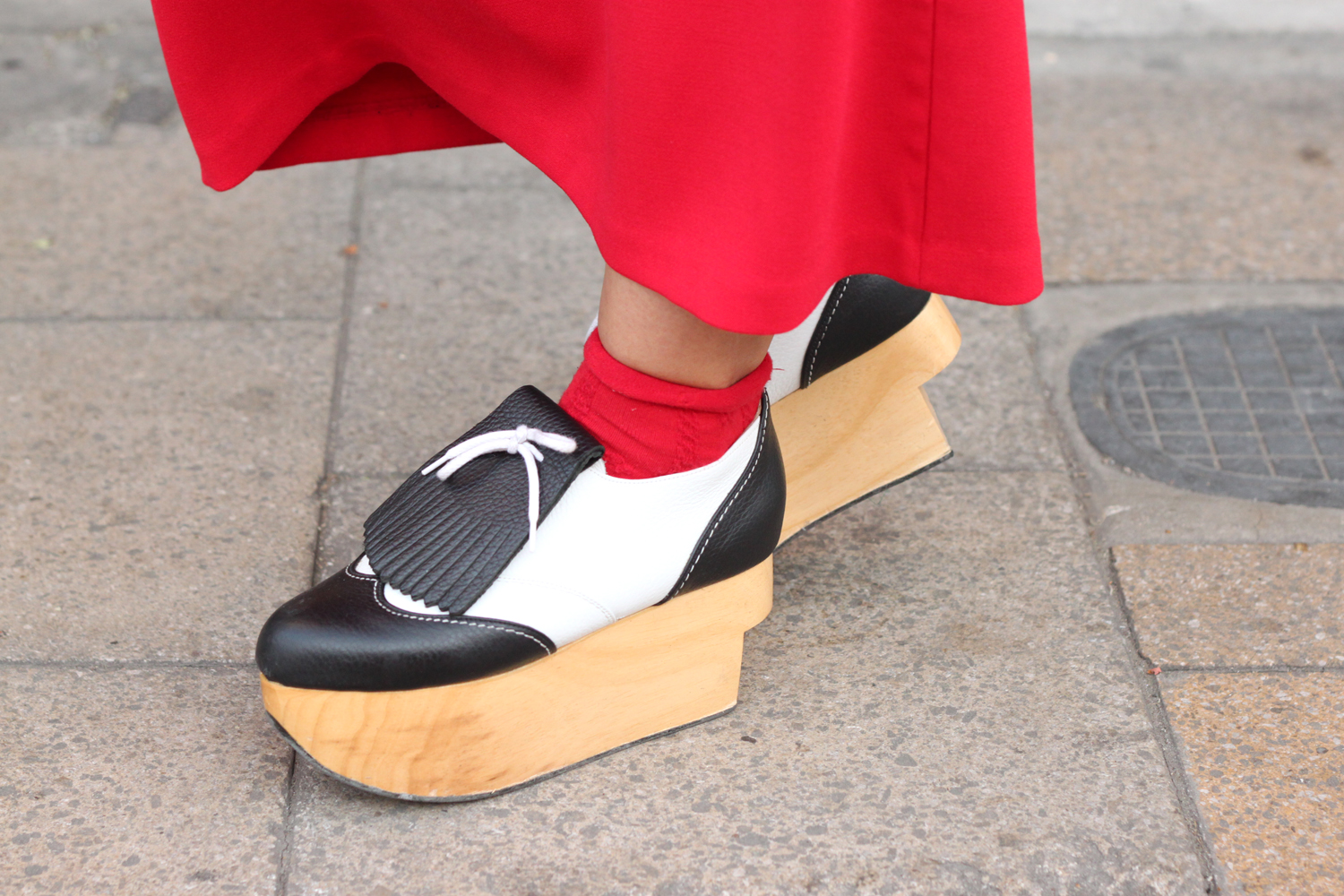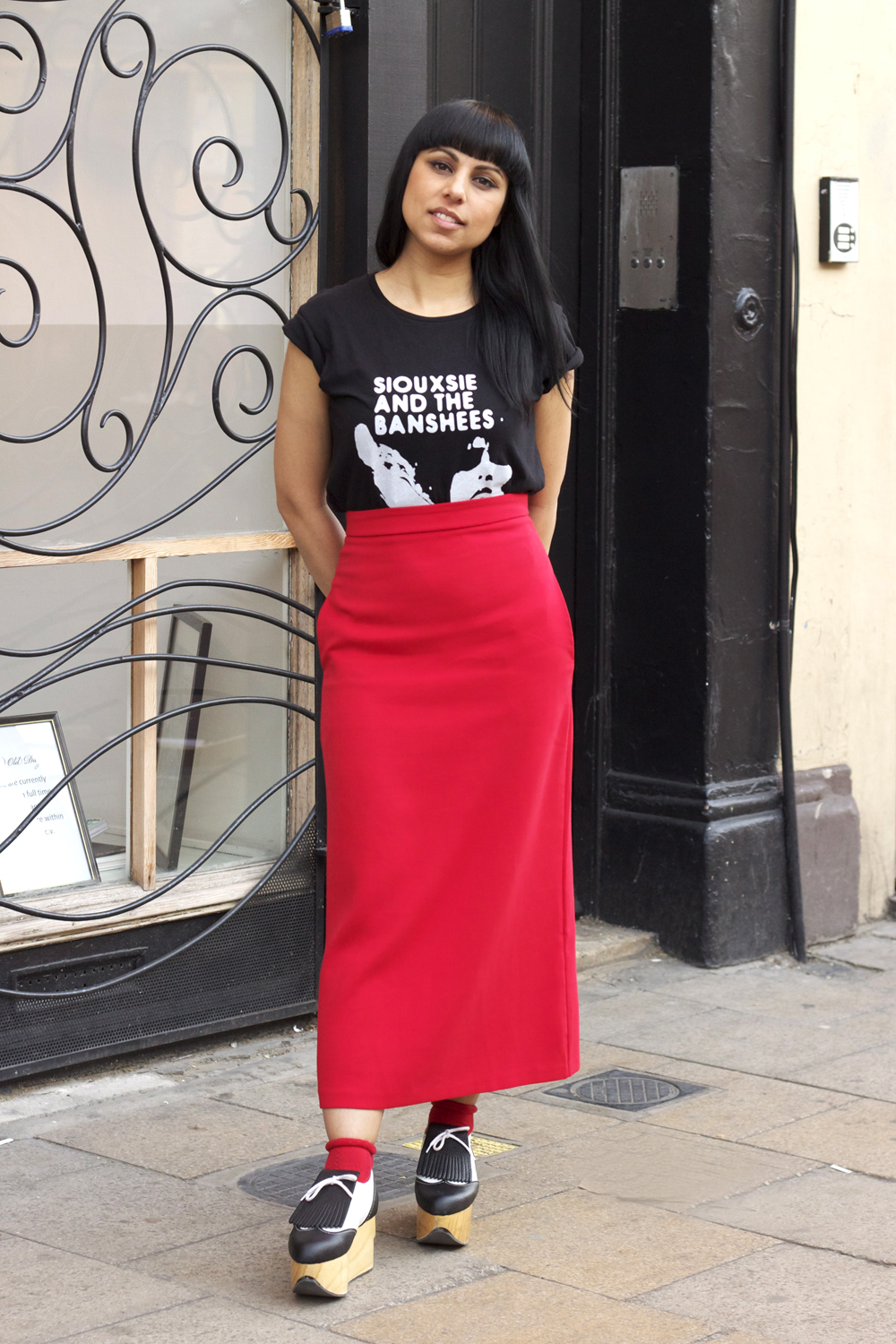 Feast your eyes on these beauts my friends. Sassy’s Vivienne Westwood shoes are one stonking pair. Part minimal brogue, part Japanese geta, these top off a truly delightful, modern outfit. Sassy also wears skirt and t-shirt from ASOS and socks from Topshop.