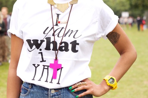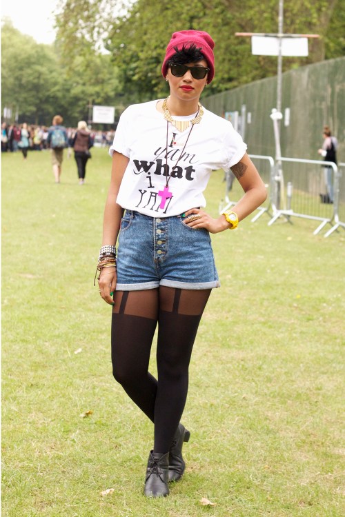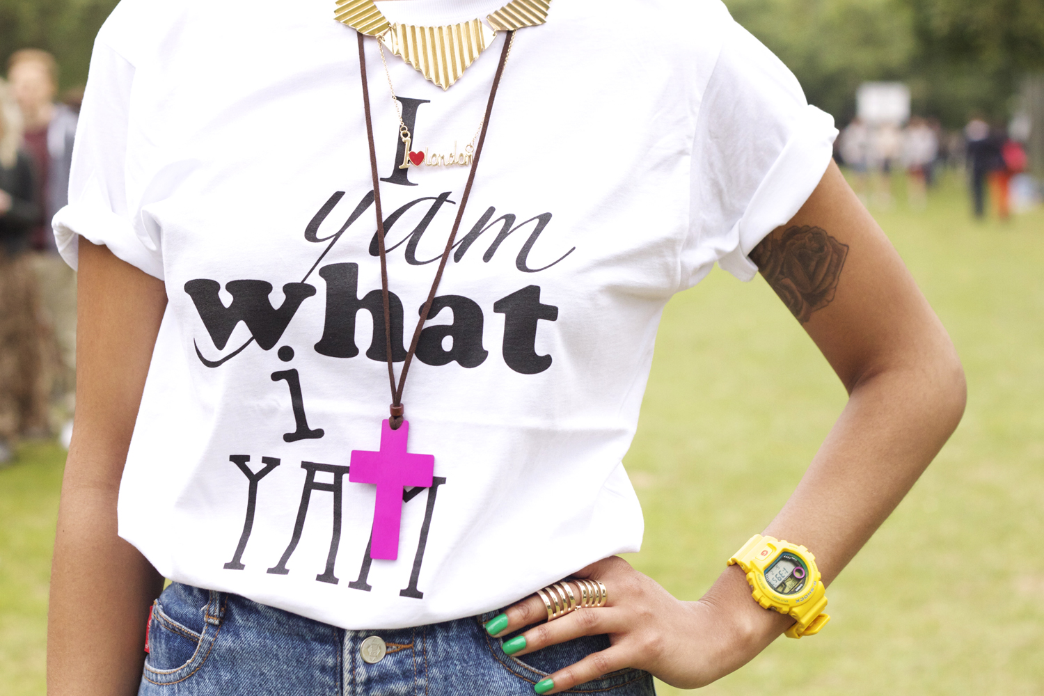 Hollie’s humorous tee + high waisted shorts + piles of jewellery = a winning festival combo. She wears vintage boots, shorts from Rokit, tights by House of Holland, t-shirt by One U, Ray Ban sunglasses, gold necklace from Topshop, cross and ‘I love London’ necklace from Forever 21 and watch by G Shock.