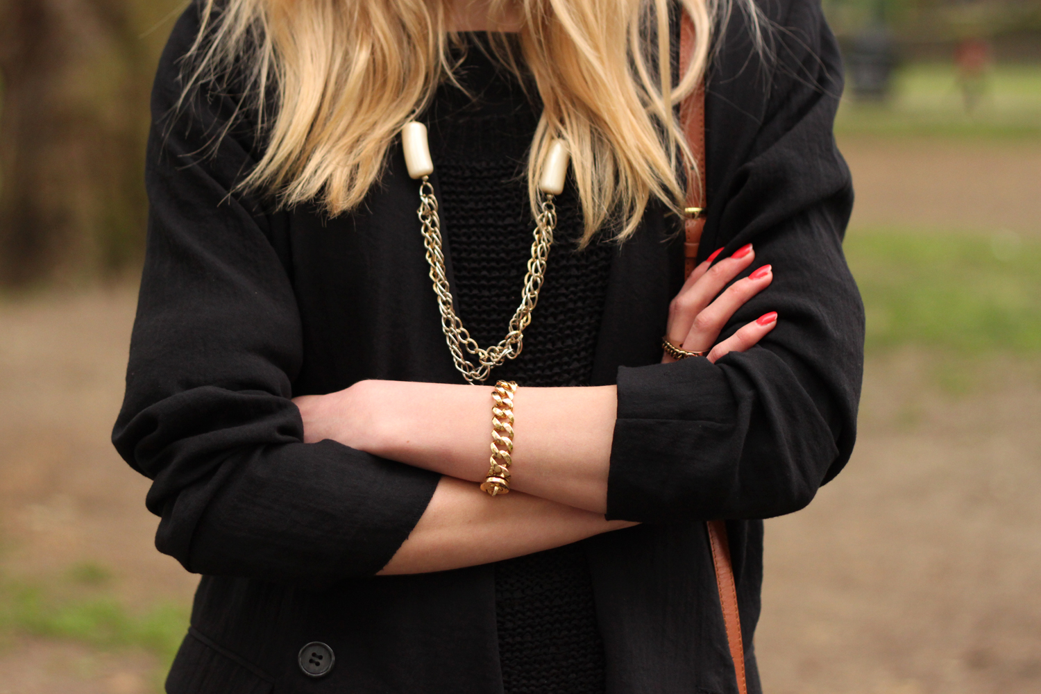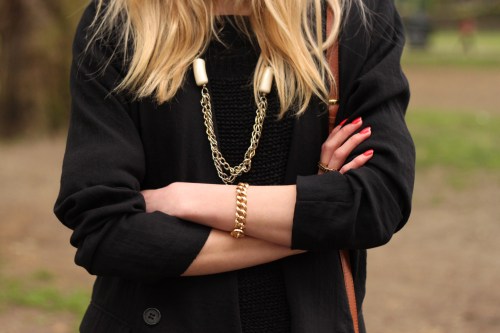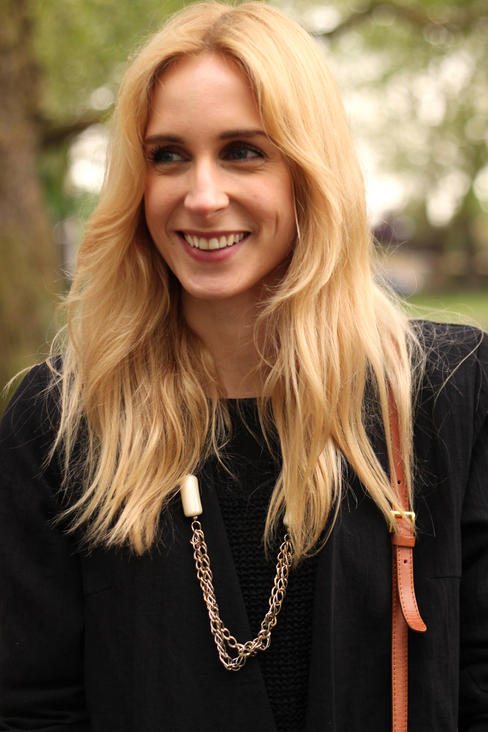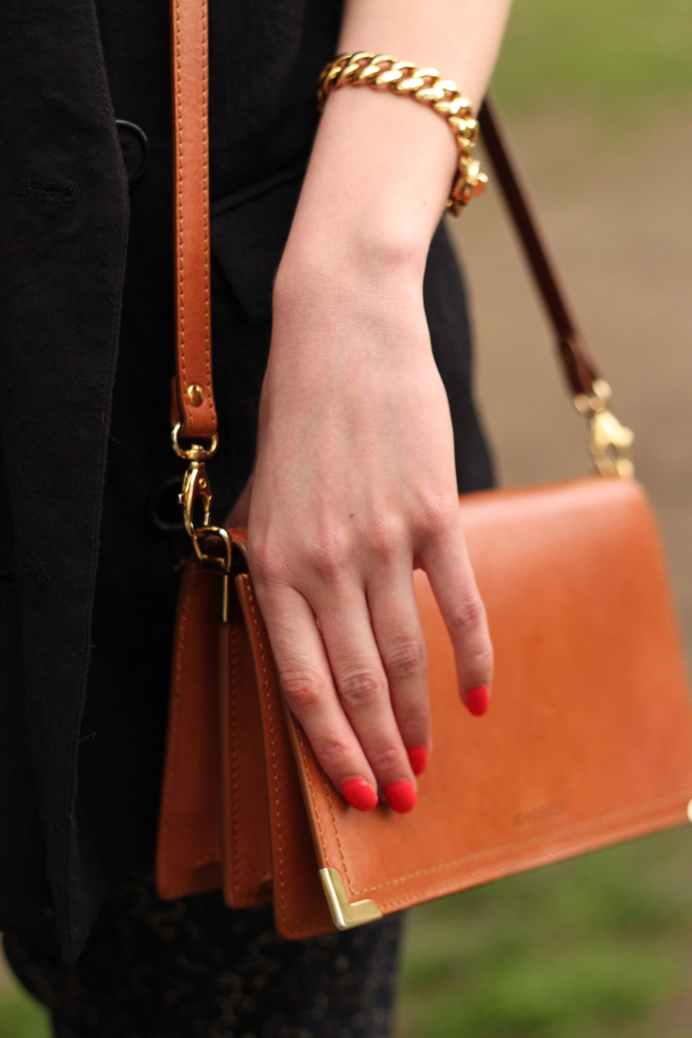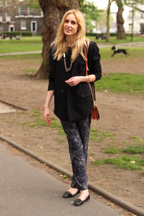 Mei teams a classic blazer from Weekday with on-trend printed trousers by M&S for an elegant look. She also wears a bag by Whyred, ring from the V&A Museum, shoes from Topshop, Marc Jacobs bracelet and a vintage necklace.