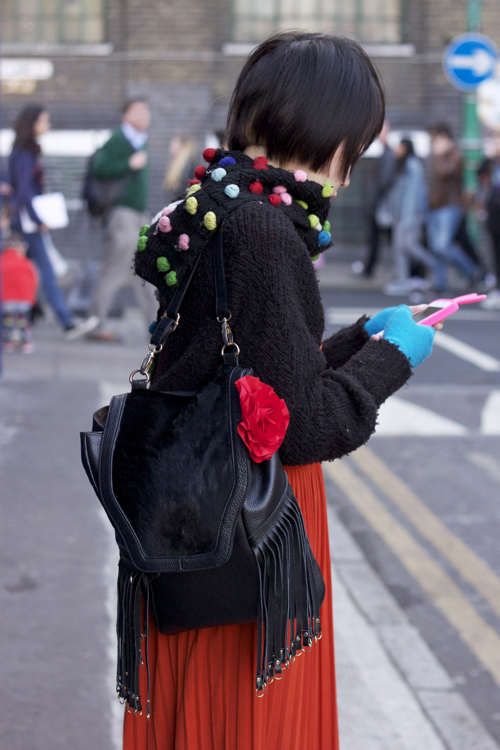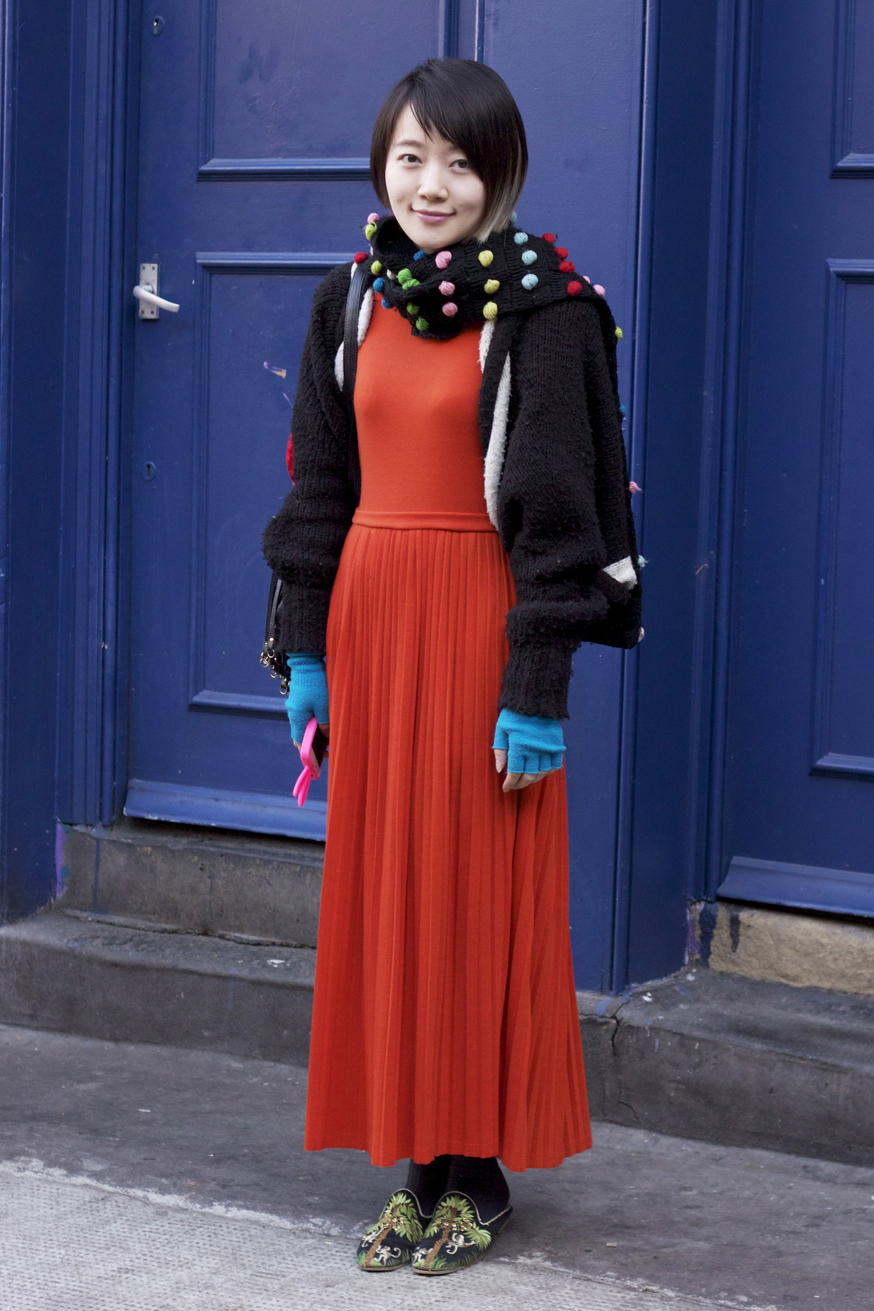 Ani’s colour-popping outfit brings a smile to my face. I love her combination of bright block colours, pom poms, delicate embroidered monkey slippers and not forgetting, her novelty bunny iphone case. J’adore!