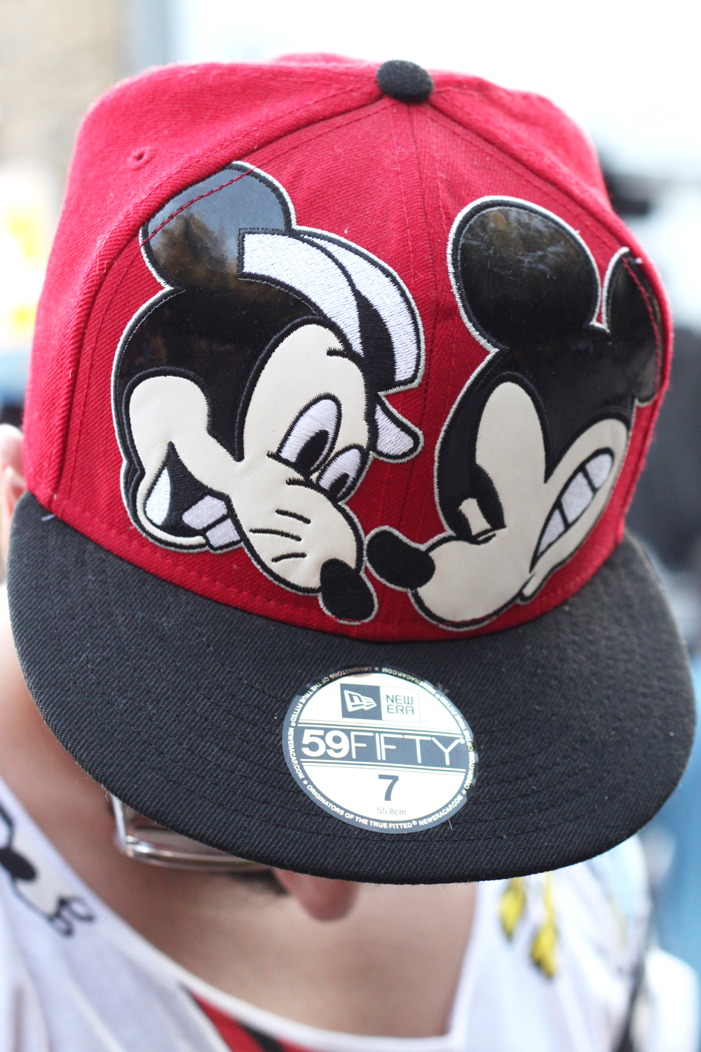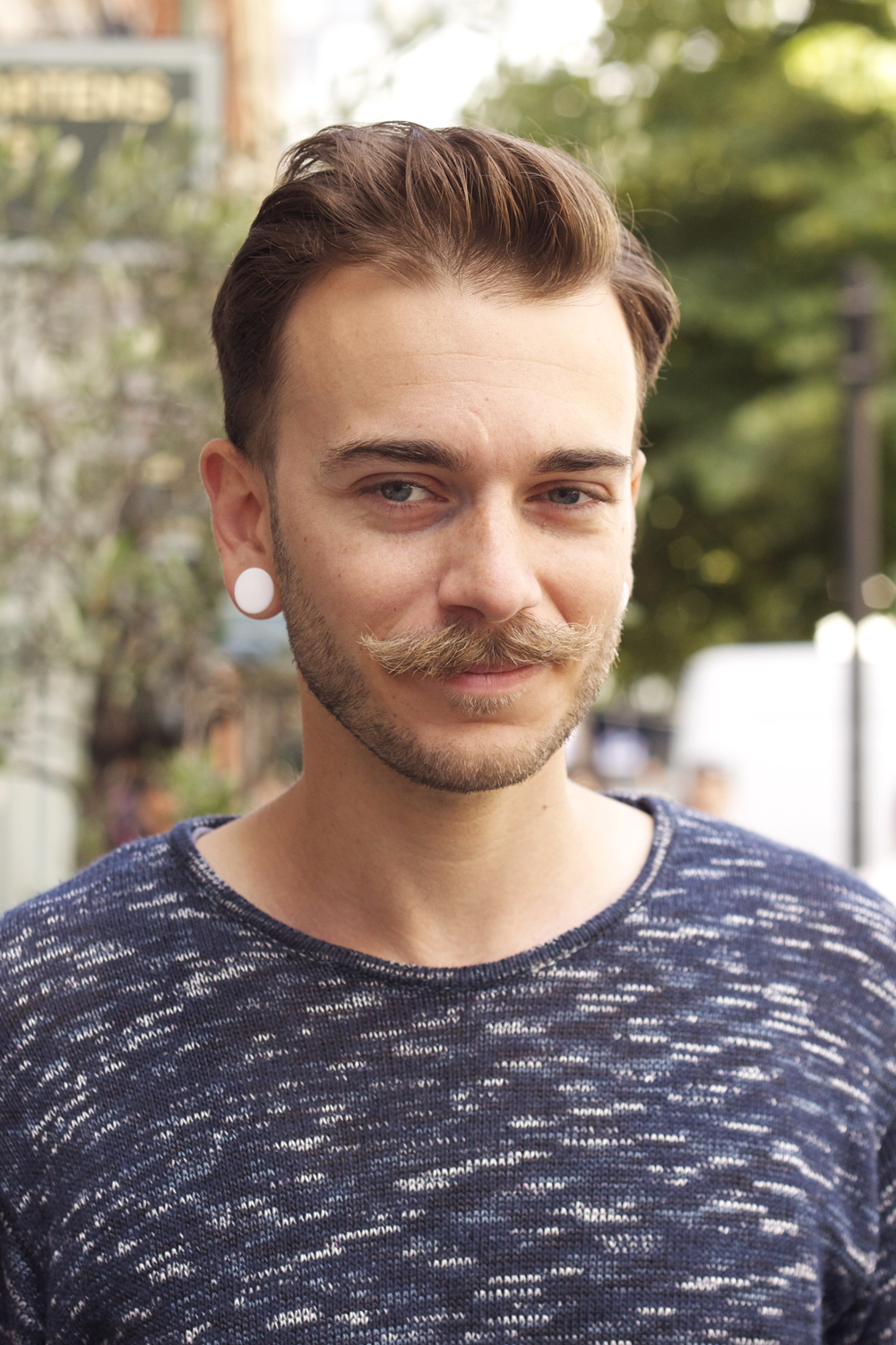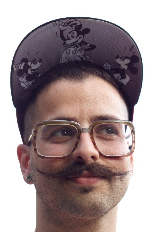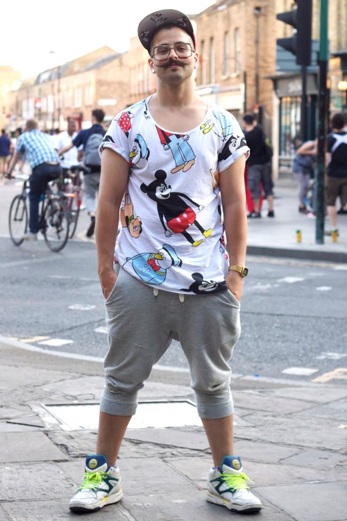 This is Cristian, a graphic designer from Barcelona living in London. With a clear penchant for Micky Mouse and friends, Cristian’s cartoon style is playful pop. His moustache is worthy of a gold medal and adds an extra dash of humour. Cristian wears a Lazy Oaf t-shirt, Topman sweats, New Era cap, Reebok Pumps and a Casio watch.