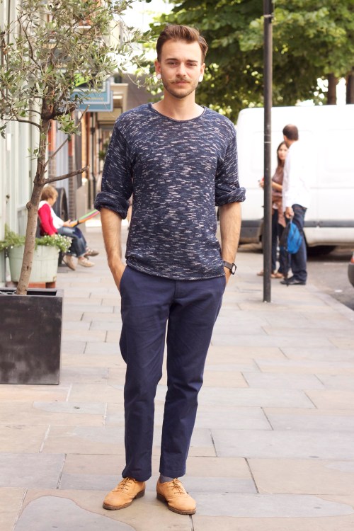 Gael is a fashion photographer from Dalston. Take a look at his beautiful photographs here. He wears a jumper, trousers and socks by agnès b, shoes by Opening Ceremony and a watch from Muji.