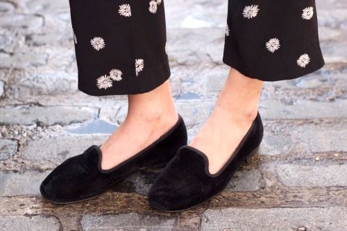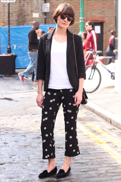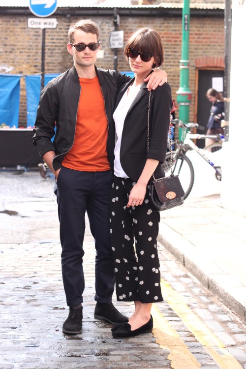 Edmund and Rebecca are such a polished pair that I had to interrupt their Sunday stroll down Brick Lane to get a photo. I particularly love Rebecca’s chic look with her ankle-swinging-monochrome-print trousers, classic white tee and blazer. But the devil is really in the detail here- check out her Mulberry Lily bag and gorgeous velvet slippers. Rebecca’s bound to look great- she’s the womenswear manager at START London.