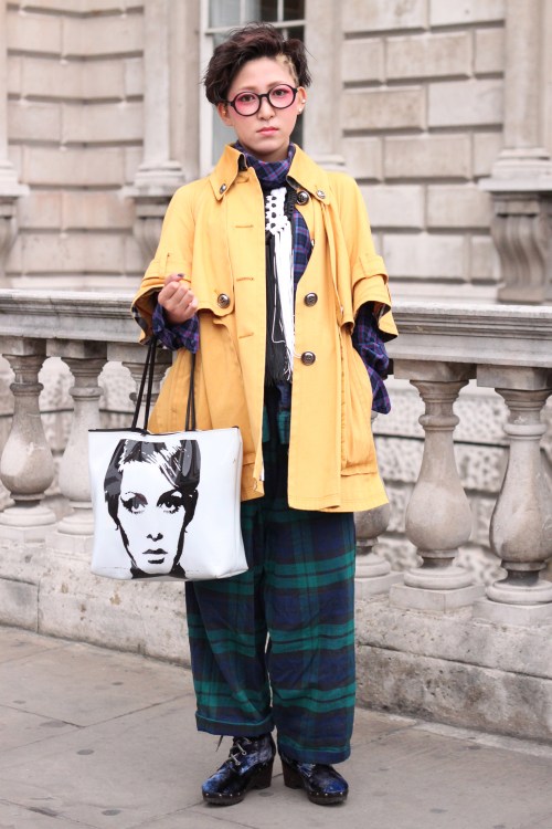 Mao (above) is a student from Japan. She wears a coat by Burberry, necklace from Japan, trousers by Comme Des Garcons, shoes by Opening Ceremony and shirt by Chloe.
