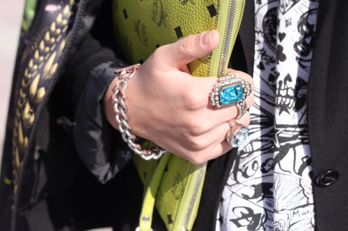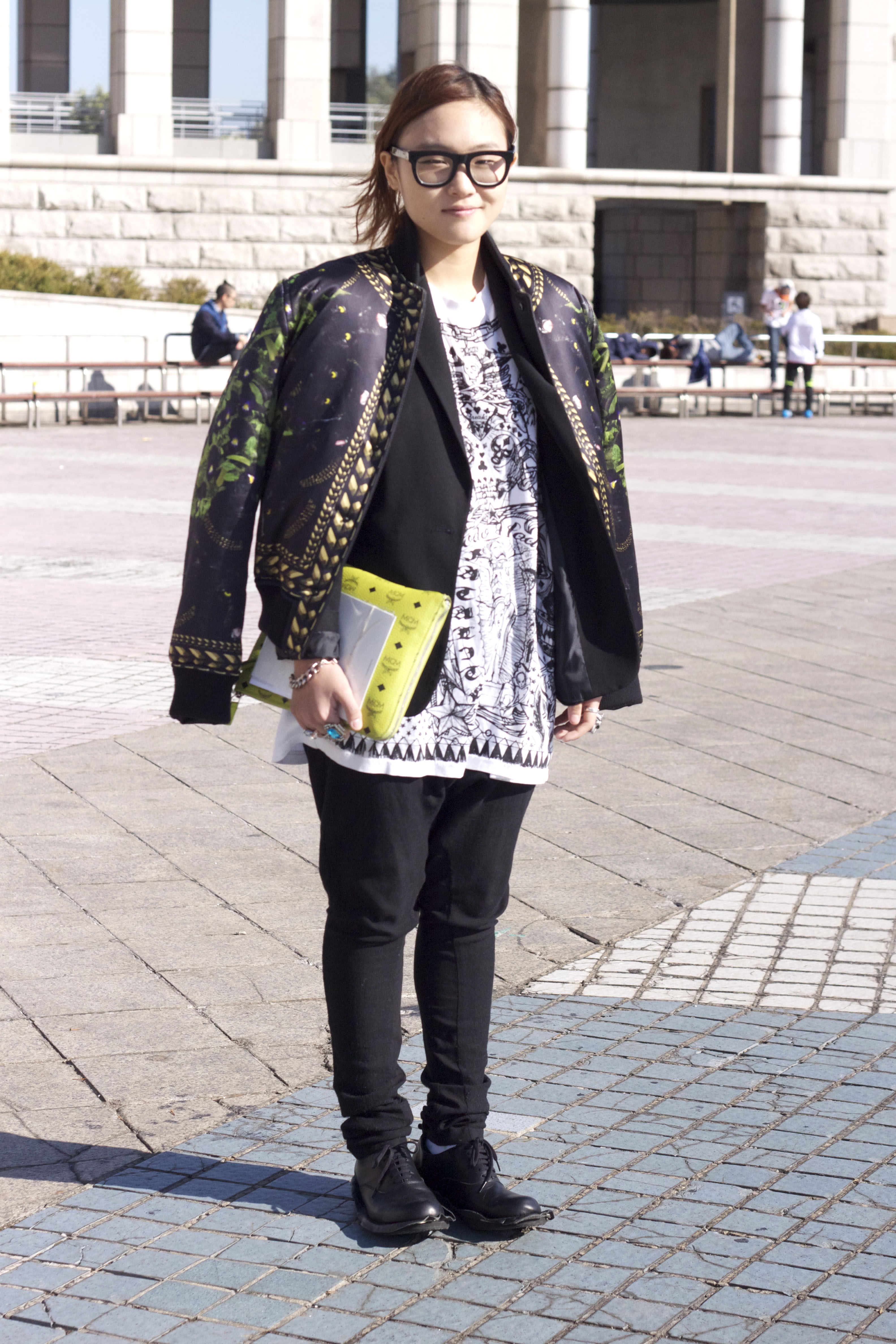 There have been some nods to the dark side amongst the fashionistas at Seoul Fashion Week. Dong Yun is a student and wears a Givenchy jacket and t-shirt, blazer from a store in Seoul, Ann Demeulemeester trousers, Comme Des Garcons boots and an MCM clutch.