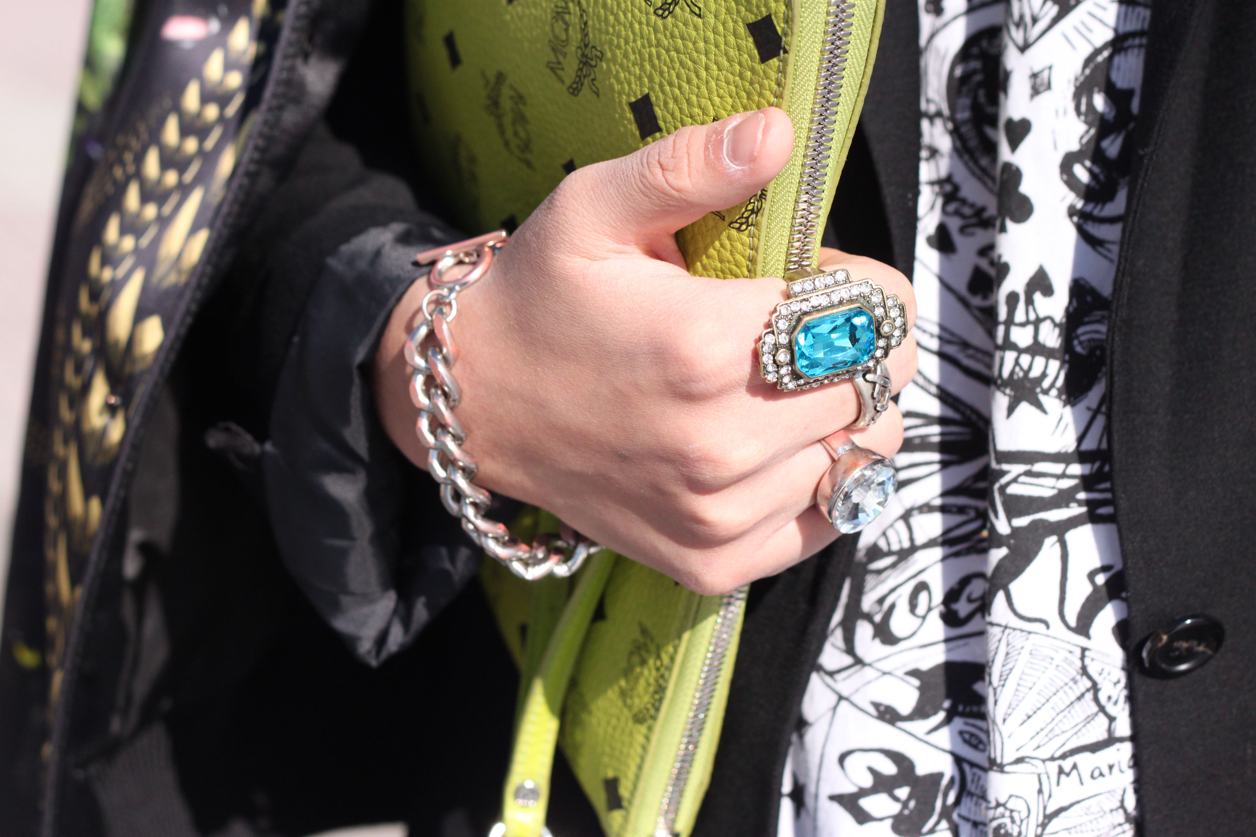 Here’s Gildakoral Flora looking blingin’ sparkly in Milan. She wears shoes by Max Kibardin, a dress by Marco Bologna, a Proenza Schouler bag and Valentino sunglasses.