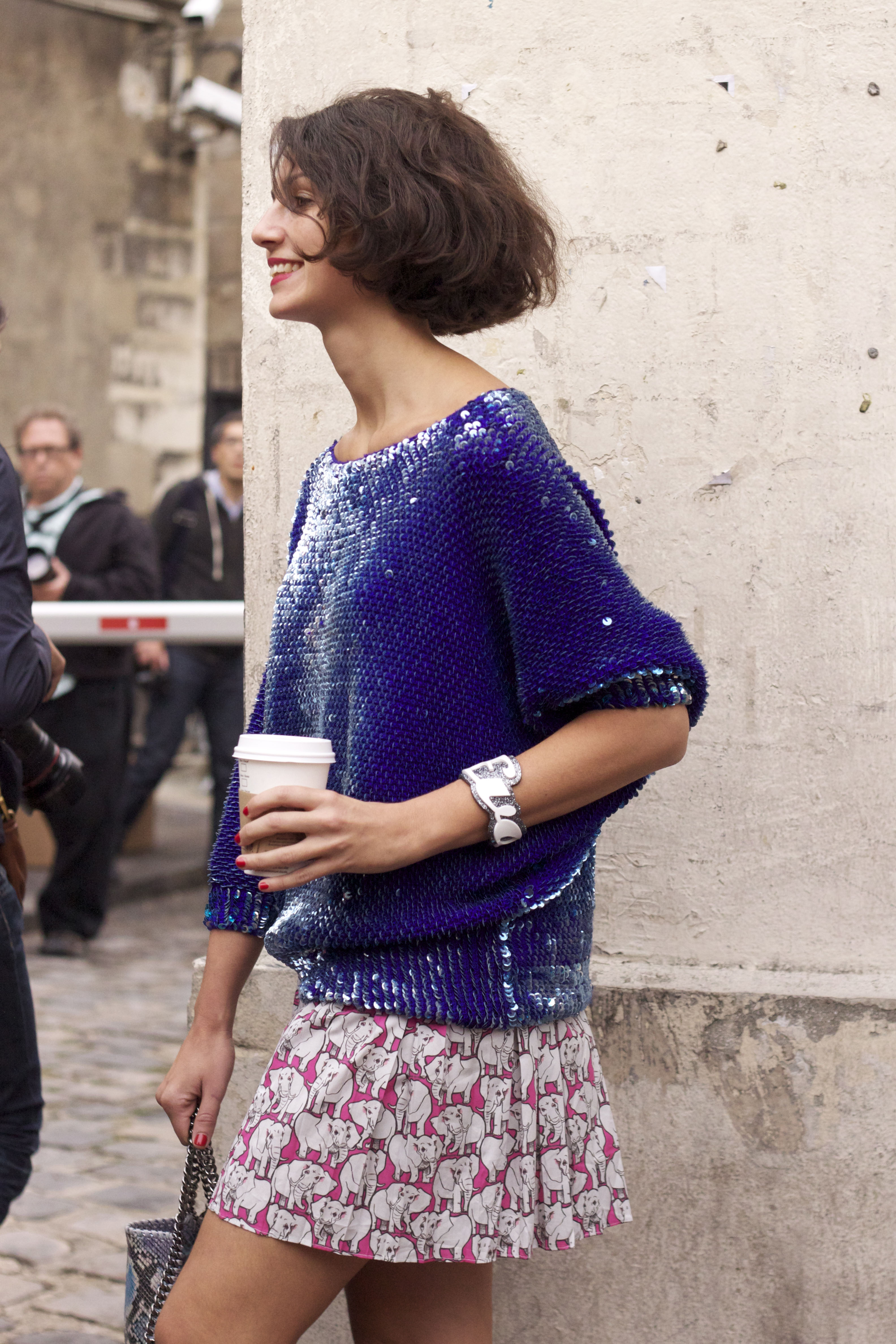 I’m very much enjoying Sophia’s mix of textures with her leather fringed skirt, wooly jumper and studded collar. She wears a Zara skirt and blazer, Primark jumper, sunglasses and jacket and Converse trainers.