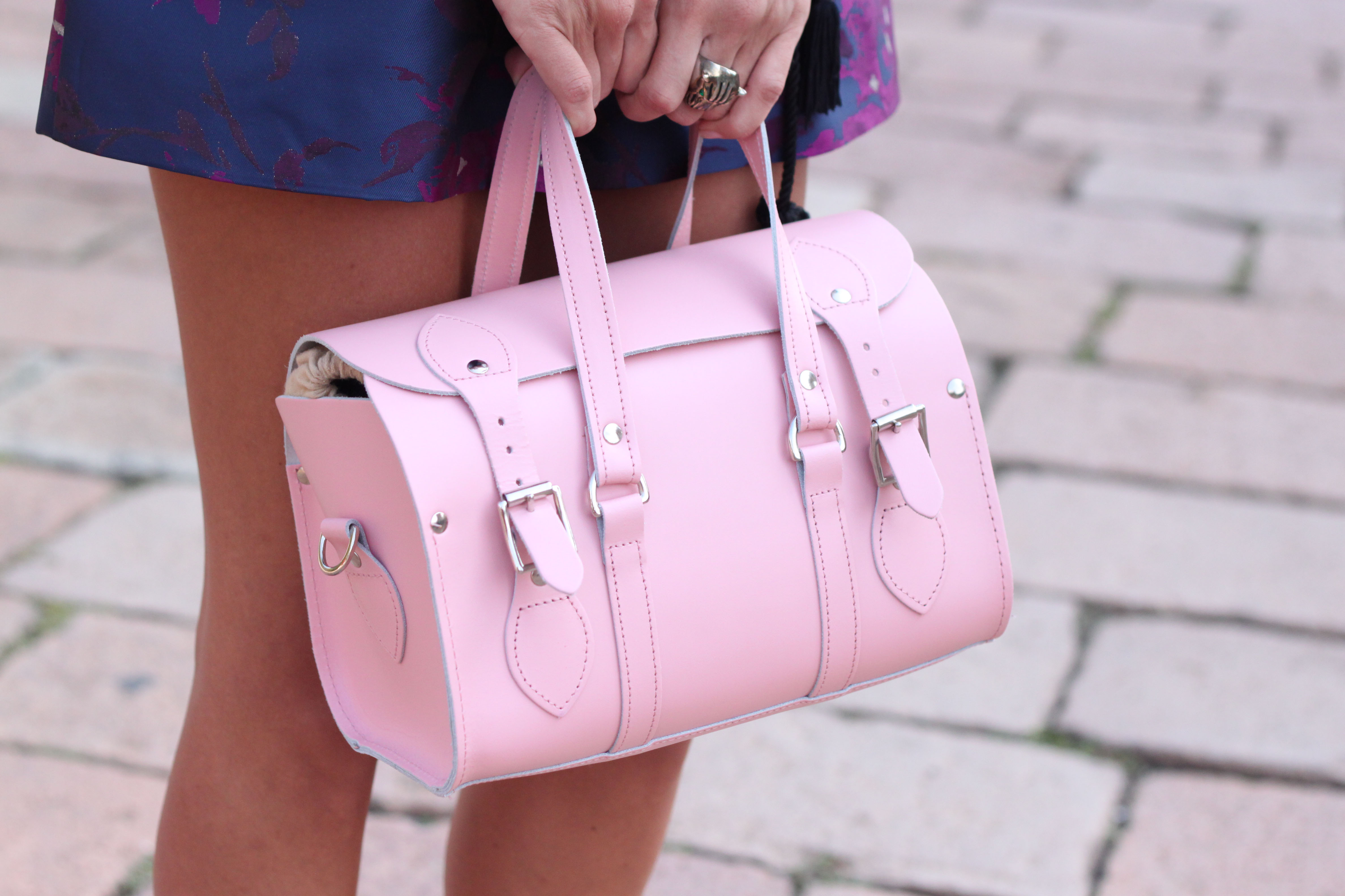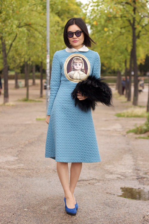 In honour of today’s Miu Miu show in Paris, here is the lovely Marta wearing top to toe Miu Miu. I met her in Milan outside the Gucci show and couldn’t resist snapping her in her pink and print combo. She wears a jumper, collar, trousers and shoes by Miu Miu, a Furla bag and bracelets by Organic Peroxide