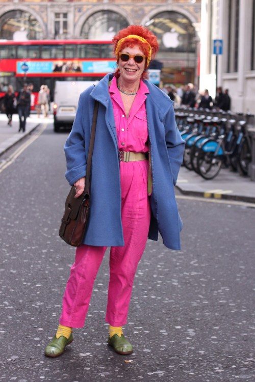 Selina lightens up the street in this juicy colour combo. Her coat is from a charity shop, she can’t remember where she bought the jumpsuit (though she knows she dyed it pink) and her shoes are from Camden.