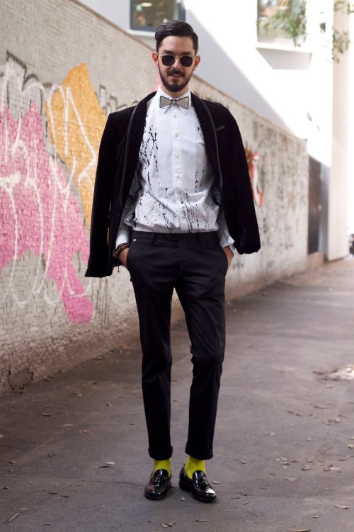 Gianmaria is a fashion designer from Milan. His shirt and bow tie are his own design, he wears a Zara jacket, Mauro Grifoni trousers and Alberto Guardiani shoes.