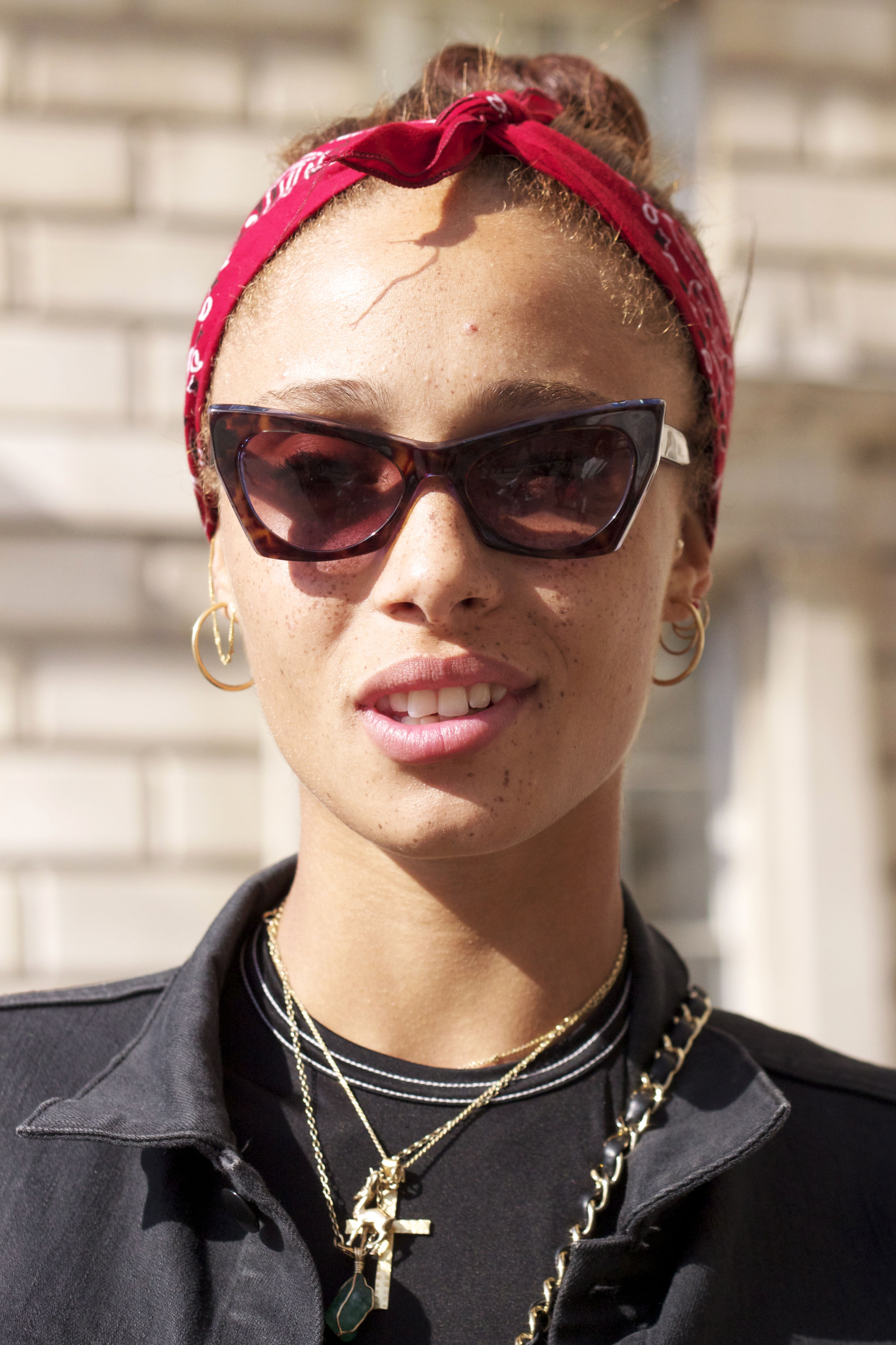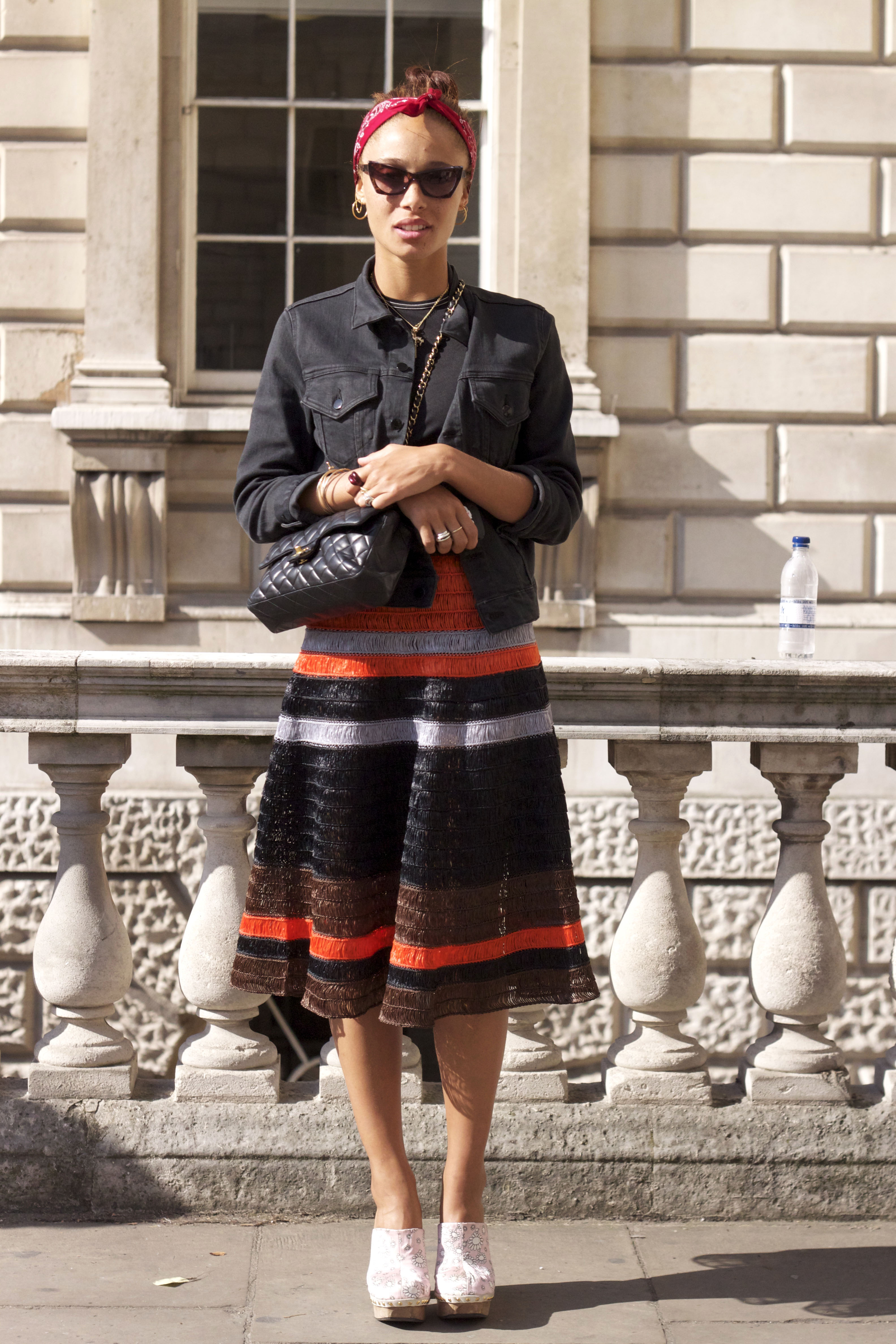 Adwoa mixes gypsy folk with a pinch of street bling and a dash of luxe to create a statement look. She wears an Alexander Wang denim jacket, Junya Watanabe for Comme Des Garcons top, a Proenza Schouler skirt, Miu Miu heels and a Chanel bag.