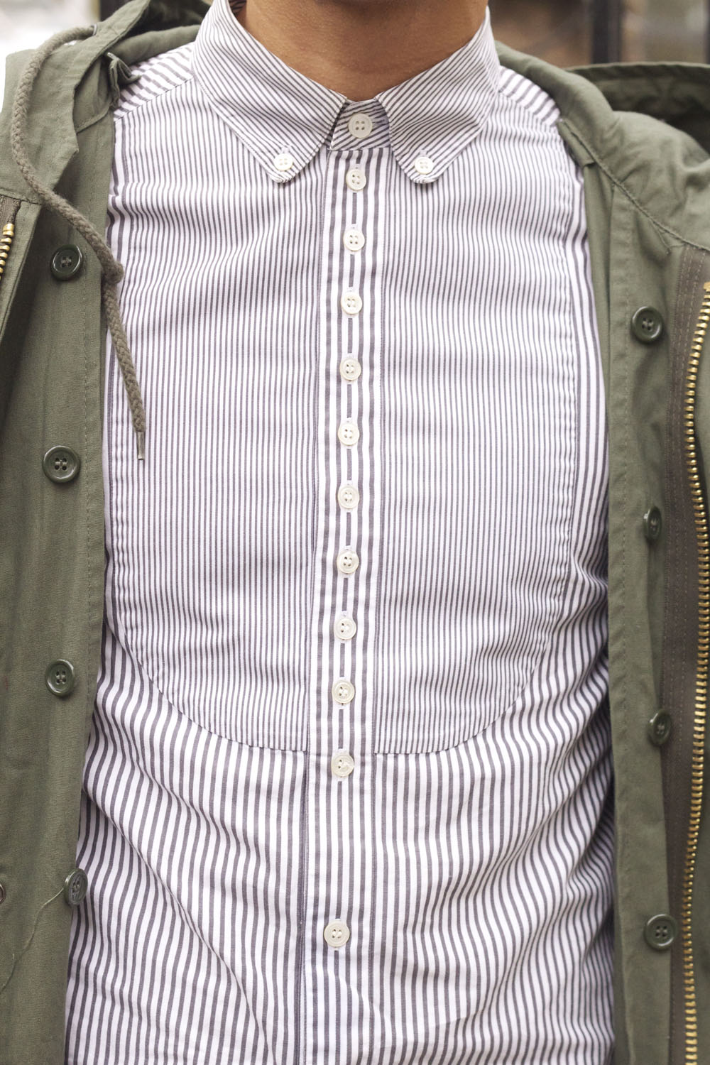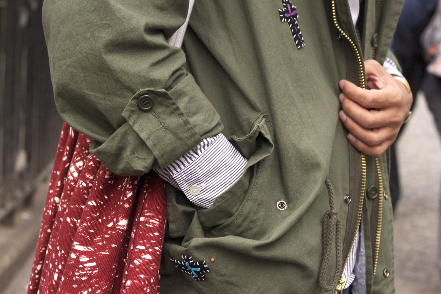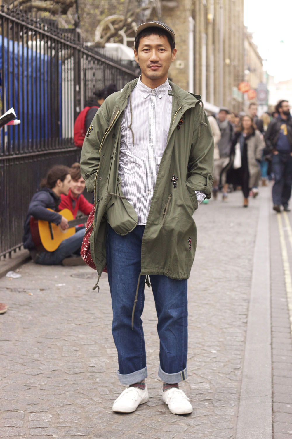 Enchong is a hair stylist from Kings Cross. He wears a Shanana Mil jacket, Present shirt, Paul & Joe jeans, Muji trainers, MM6 bag and his hat is from a thrift store in Japan.