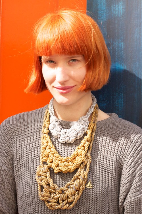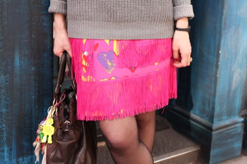 Julie is a girl of many talents. She has style, the most dazzling orange hair and is also an amazing jewellery designer. Originally from Norway, her jewellery made from braided cord is beautifully unique and lightweight. Check out her blog here to see her designs. Julie wears American Apparel jumper, Versace for H&M fringed skirt, Miu Miu shoes and handbag and American Apparel watch.