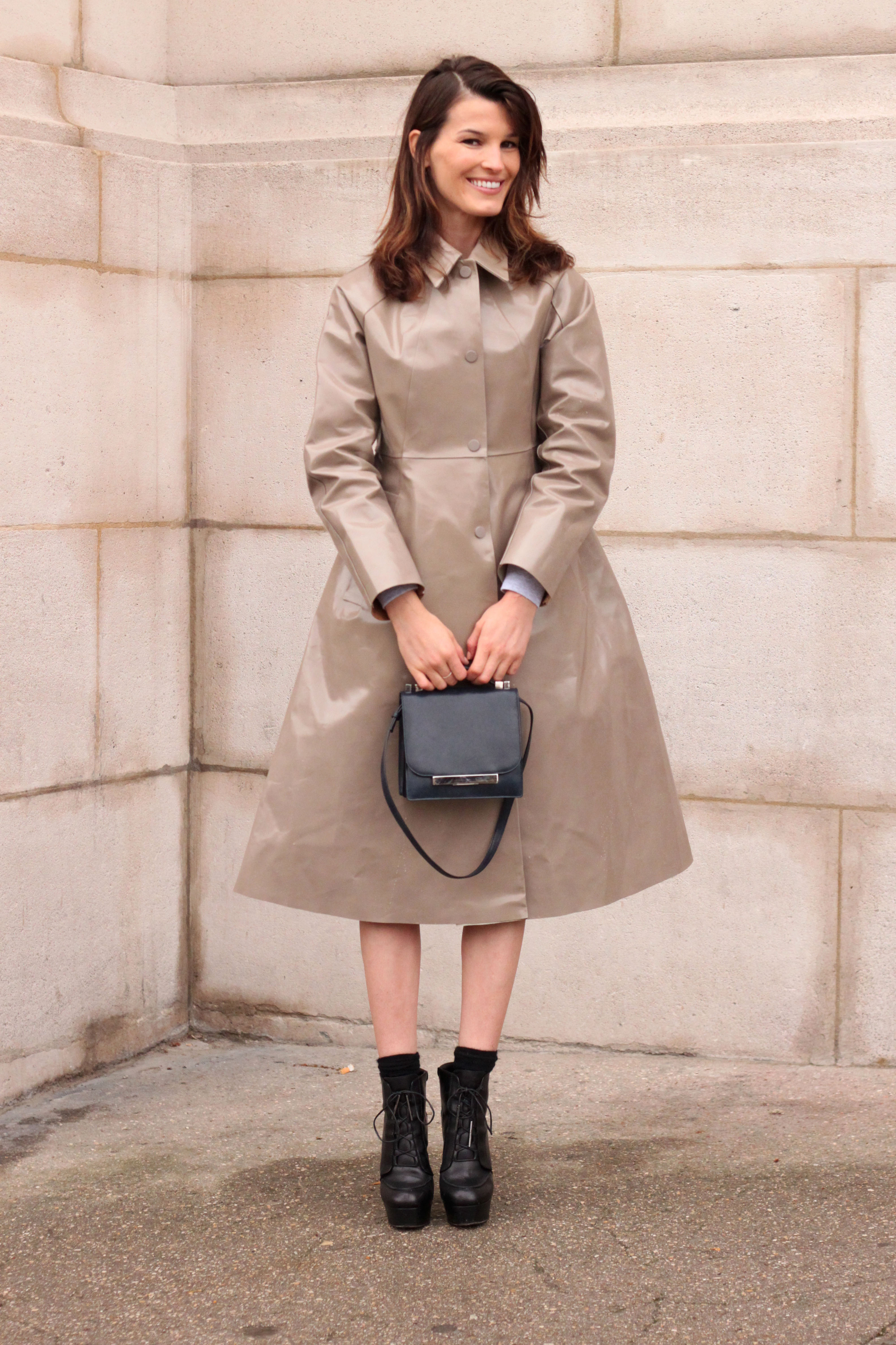 The heavens have opened in the UK, so we should all take a leaf out of Hanneli Mustaparta’s book and dress for the weather. She looks damn cool in an A-line Acne rain coat, Calvin Klein boots and a bag by The Row at Paris Fashion Week.