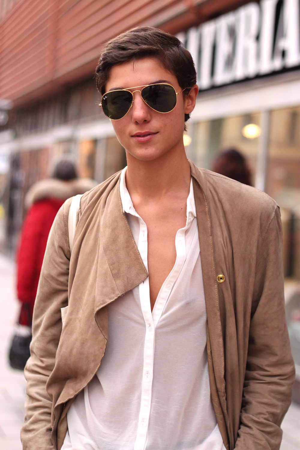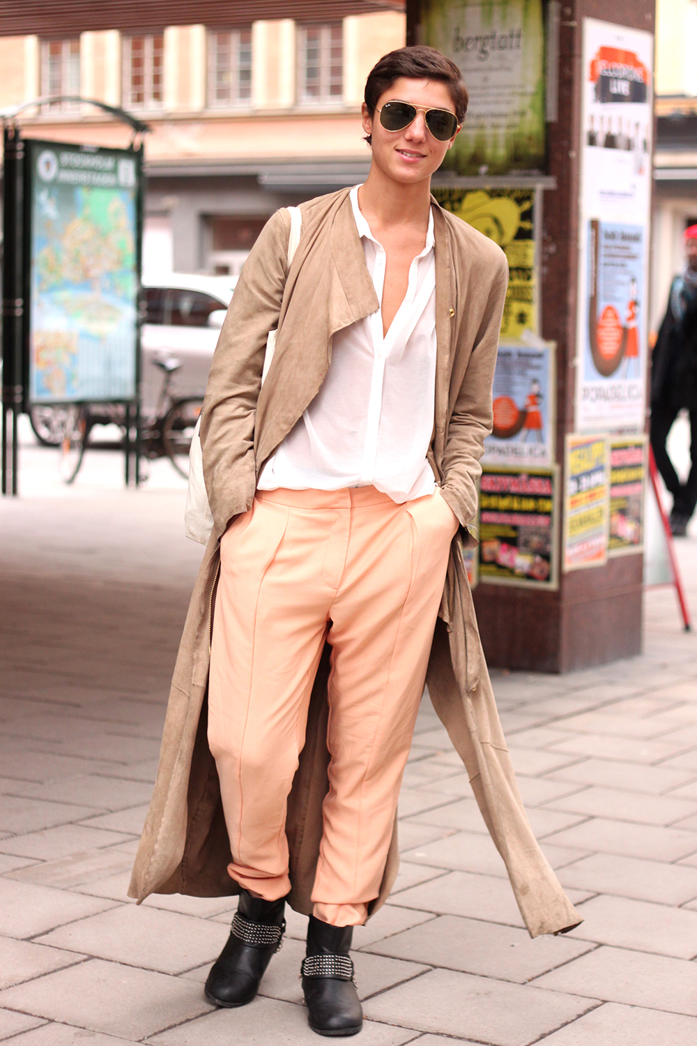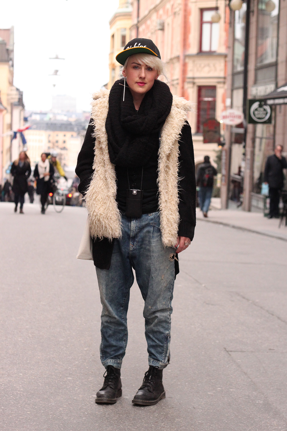 Matilda’s bold, playful outfit oozes fun and wit. I just love it! Her look is a real nod to the 80’s with the high waisted, bleached denim jeans, shiny bomber and hair scrunchie. The over sized, layered pieces are worn with confidence and a strong dash of youthful spirit that very few people could pull off. Go girl!
