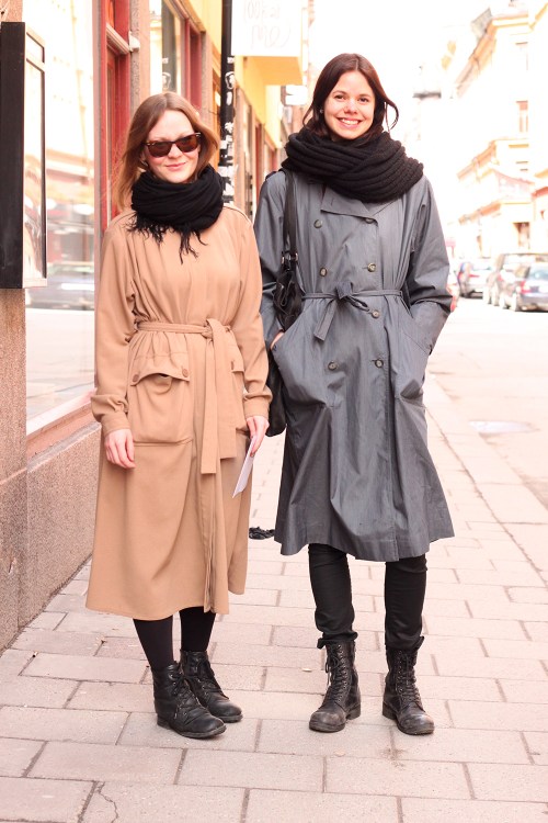 Frida (left) wears a coat by Rodebjer and boots from Grandpa. Julia (right) wears a vintage mac with boots from Vagabond
